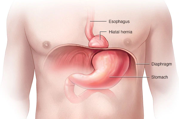 Hiatal hernia occurs when the upper part of stomach bulges through an opening (hiatus) within the diaphragm. The diaphragm is a large muscle, which separates your abdomen and chest.